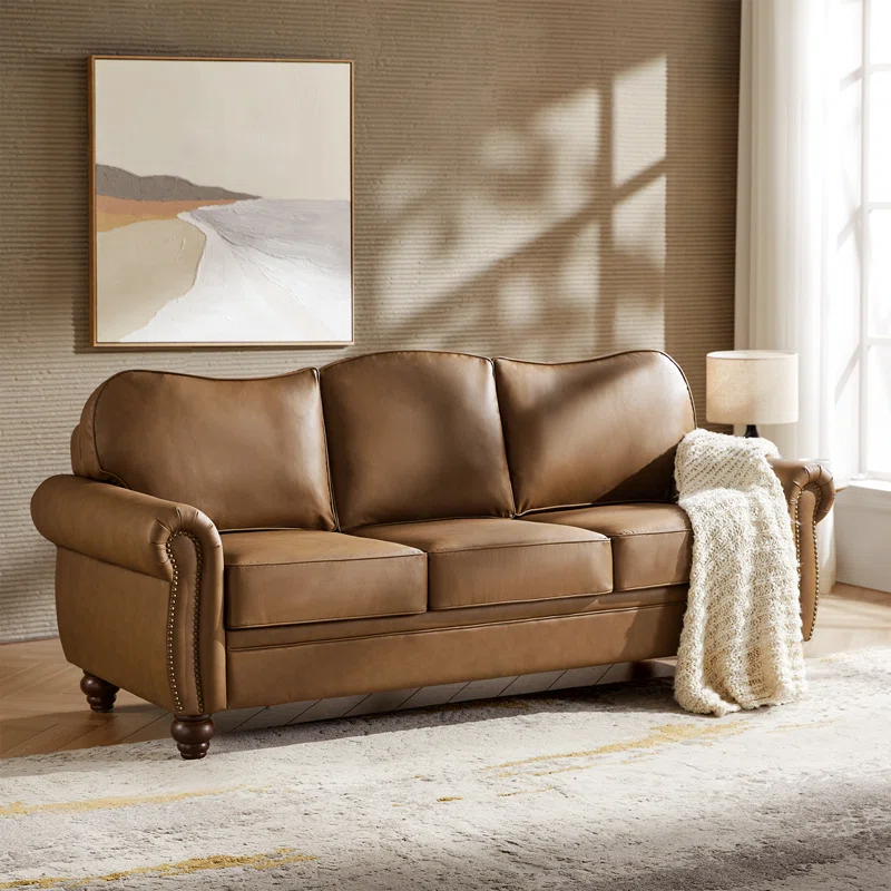 The stylish sofa showcases durable vegan leather upholstery, offering both visual appeal and durability. Its transitional design seamlessly complements various decor styles, while the round rubber wood legs ensure a solid, stable base and add a touch of elegance. The decorative nailhead trim enhances its sophisticated look, and the rolled arms provide a classic, comfortable feel. For comfort, the sofa features high-density foam cushions paired with a supportive spring system, delivering a comfortable and enjoyable seating experience. This sofa combines beauty with practicality to elevate your living area, suitable for your contemporary or transitional space.